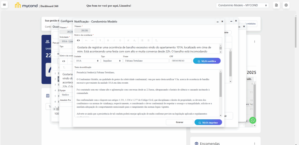 Desenvolvida pela MyCond, a MYIA Notifica é a inteligência artificial especializada em gestão de ocorrências e notificações condominiais. Diferente de ferramentas que apenas sugerem texto, ela lê e interpreta o conteúdo da ocorrência, identifica se o caso é passível de notificação e elabora uma resposta coerente e jurídica, alinhada ao Regimento Interno, à Convenção e ao Código Civil Brasileiro.